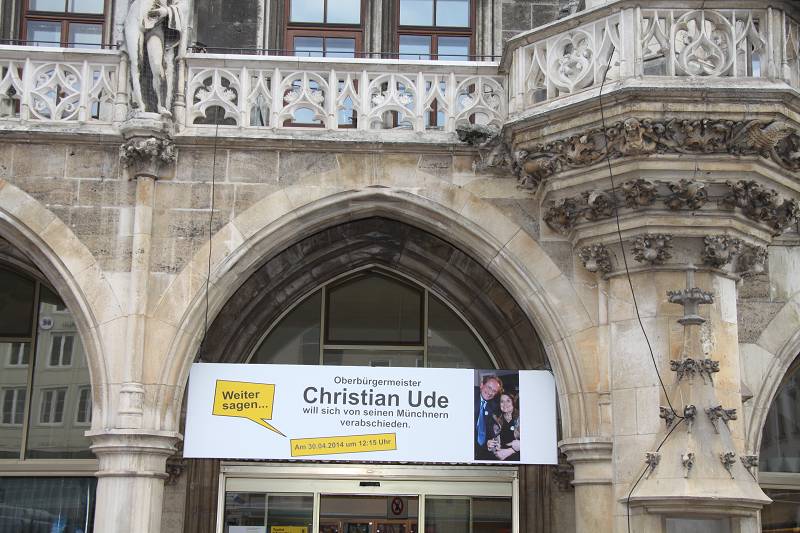 Münchens wortgewaltige Oberbürgermeister Christian Ude verabschiedete sich aus Altersgründen bei Blasmusik nach zwanzigjähriger Tätigkeit als Oberbürgermeister von München vor tausende von Münchner vor dem Rathaus am Marienplatz.Denn laut noch nach dem alten gültigen Gesetz darf ein Oberbürgermeister aus Altersgründen (66 Jahre) nicht mehr gewählt werden, wenn er ein bestimmtes Lebensalter erreicht hat.Erreicht hat Christian Ude (SPD) für Münchner viel im Wohnungs – und Städtetbau.So wurden in seiner Amtszeit etwa an die 125.000 Wohnungen errichtet, und somit die Wohnungsnot gelindert.Viele Kultur – und Schuleinrichtungen geschafffen oder finanziell von der Stadt unterstützt.Sein Steckenpferd war aber der Ausbau der Tramlinien in München. Bei seiner letzten gestrigen Rede als Stadtoberhaupt sprach er -liebe Münchner, zuerst kommt eine schlechte dann eine gute Nachricht. Die gute Nachricht ist, daß ich heute an meinen letzten Arbeitstag als Oberbürgermeister von München eine kurze Rede halte.Sodann wurde schon gleich Blasmusik gespielt.Anschließend verabschiedete sich OB Christian Ude persönlich bei seinen Münchnern mit einen kleinen Geschenk, nämlich mit 1 Tasse (Ude Karrikaturen) und 1 Buch mit humoristischen Inhalt.
